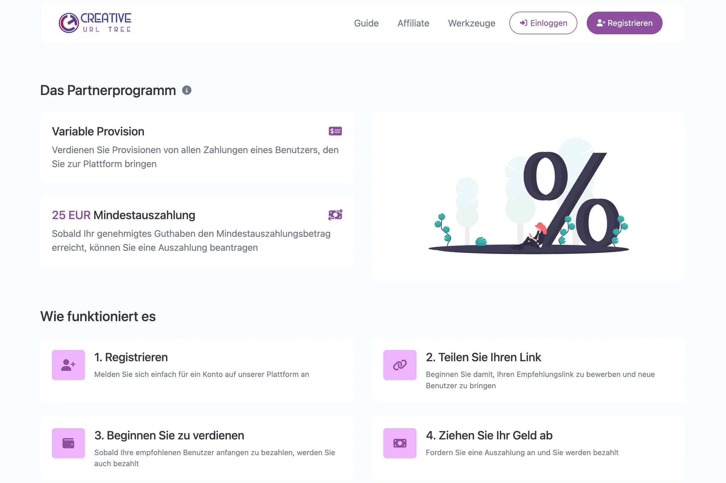 Creative URL Tree glaubt, dass jede URL eine eigene Seite verdient. Deshalb haben wir den Creative URL Tree, kurz CUTree, entwickelt. Mit CUTree kannst du Bio-Link-Seiten für alle deine gekürzten Links erstellen. Jede Seite enthält QR-Codes zum einfachen Teilen, integrierte Analysen, mit denen du deine Klicks verfolgen kannst, und eine Vielzahl anderer Funktionen, mit denen du dich von der Masse abheben kannst. Egal, ob du für deine Marke werben oder einfach nur deine Lieblingslinks mit der Welt teilen willst, Creative URL Tree ist die perfekte Lösung. Probiere es noch heute aus und überzeuge dich selbst!