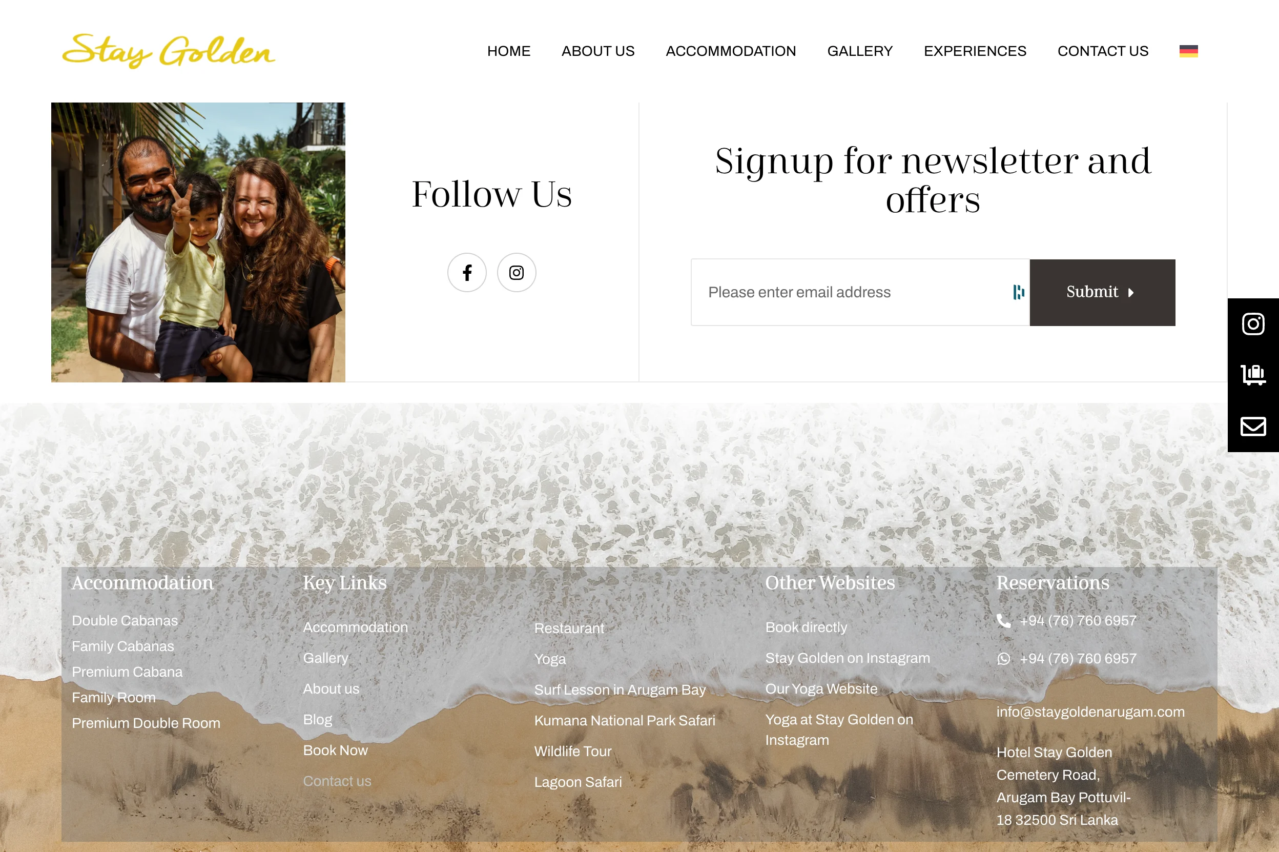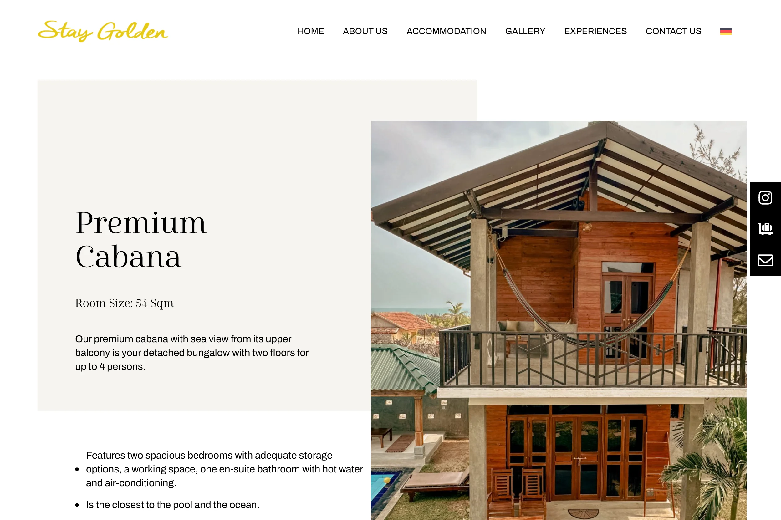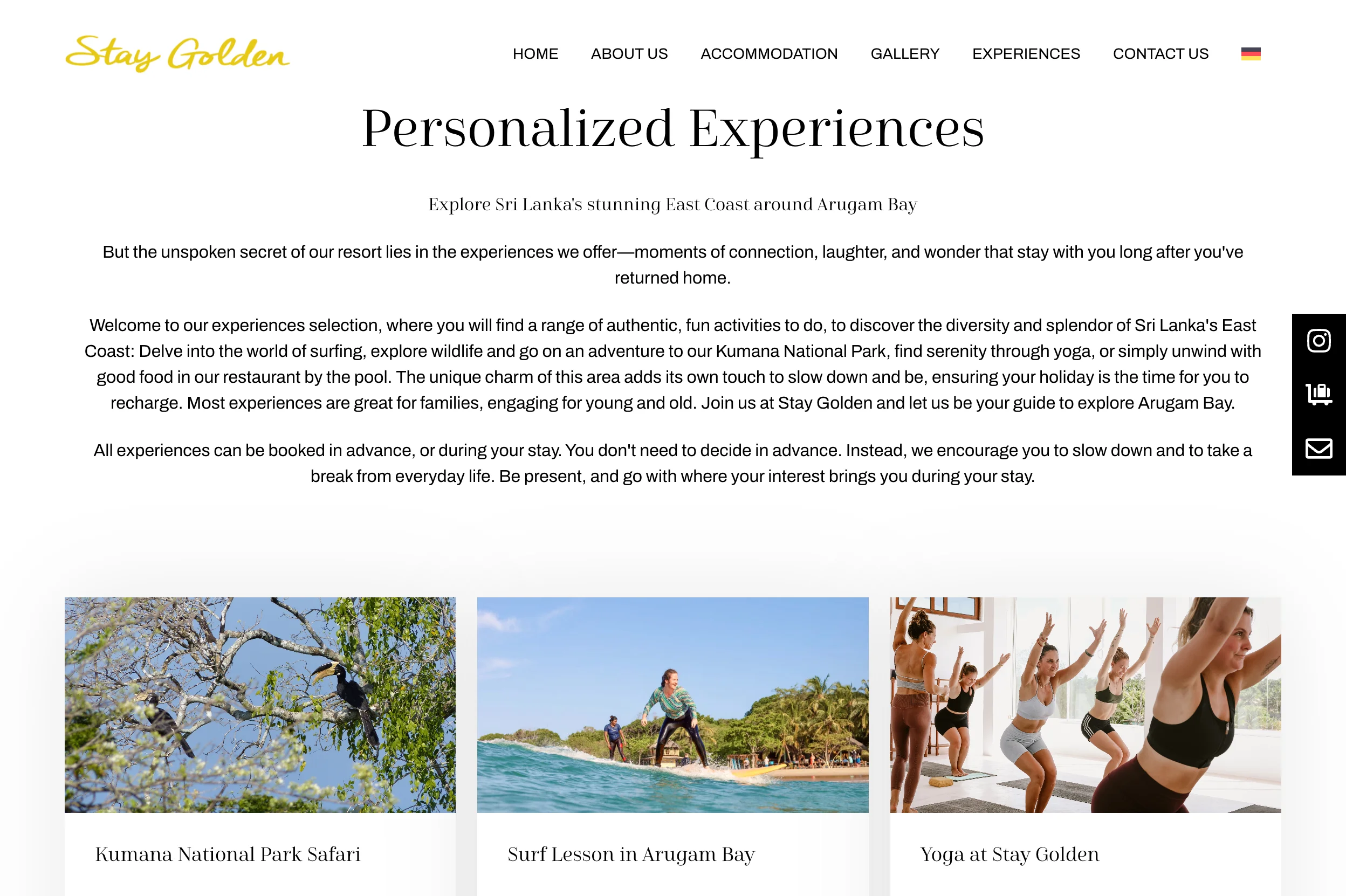 Stay Golden Arugam ist mehr als nur ein Strandresort - es ist ein einzigartiges Urlaubserlebnis an der malerischen Küste von Arugam Bay, Sri Lanka. Unser Resort verbindet traditionelle sri-lankische Gastfreundschaft mit modernem Komfort und bietet Besuchern eine perfekte Basis für unvergessliche Surfabenteuer. Die individuell gestalteten Unterkünfte spiegeln den authentischen Charakter der Region wider, während unser erfahrenes Team passende Surf-Erlebnisse für alle Niveaus anbietet. Mit einer atemberaubenden Lage direkt am Strand, erstklassiger Gastronomie und einer entspannten Atmosphäre schafft Stay Golden Arugam einen Ort, an dem Surf-Enthusiasten und Naturliebhaber gleichermaßen ihr Paradies finden.